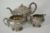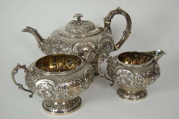 London 1820, comprising teapot, twin handled sugar bowl and cream jug, each with tapered baluster body with bold embossed scrolling and lattice decorations (3)