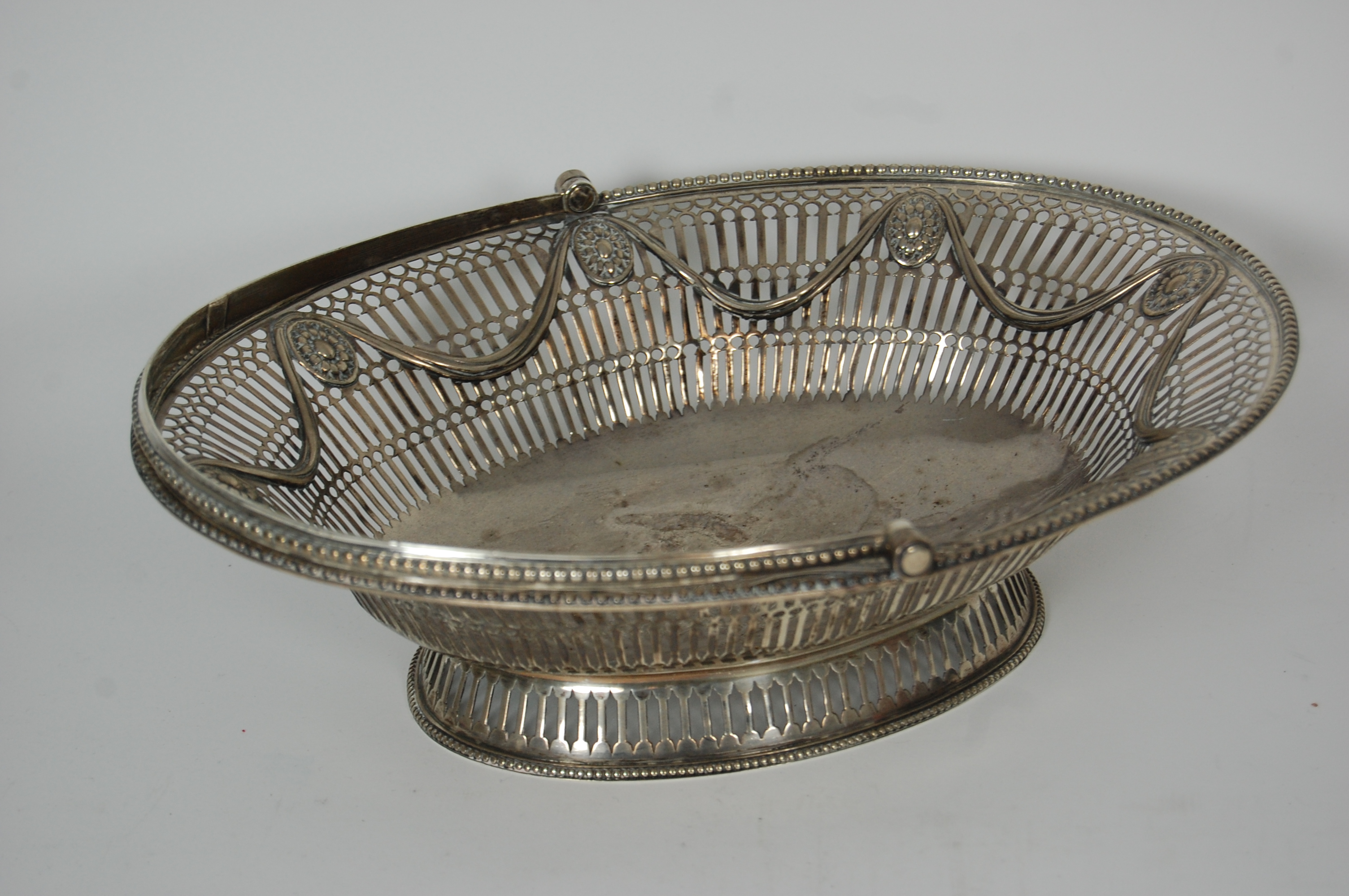 London 1816, makers mark lacking, of oval outline with beaded rim and with reticulated borders with flower head roundels and cast pendant swags, the centre engraved with an armorial and motto, with swing beaded handle and raised on a reticulated foot