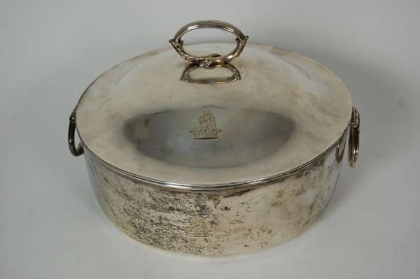 by Robert Garrard, London 1815, the simple tapered bowl with twin loop handles and pull off domed cover with naturalistic loop handle, both cover and base with engraved crest