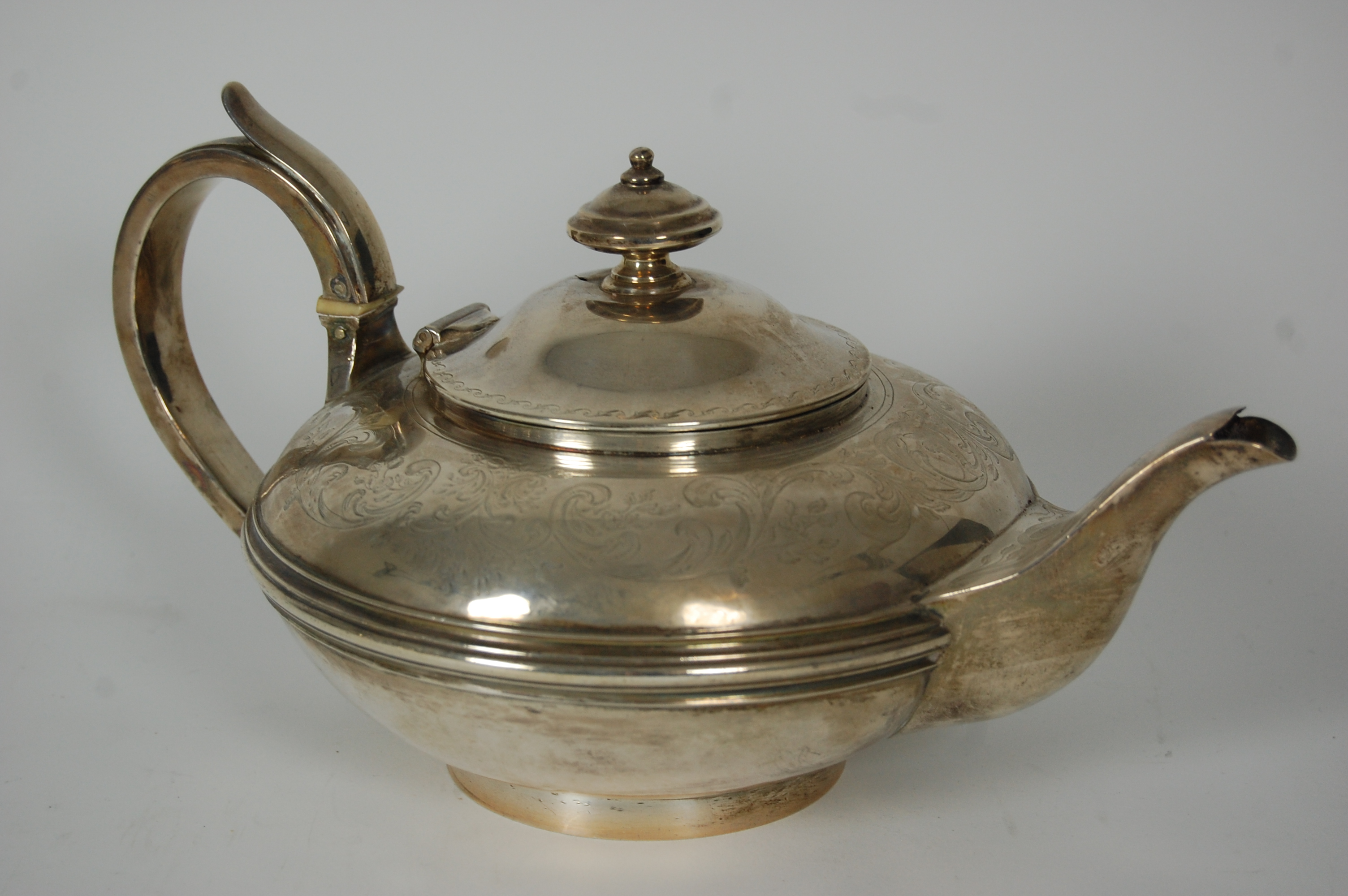 TS London 1813, of squat circular form with engraved foliate scroll borders and short curved spout
