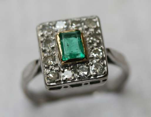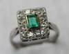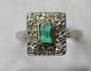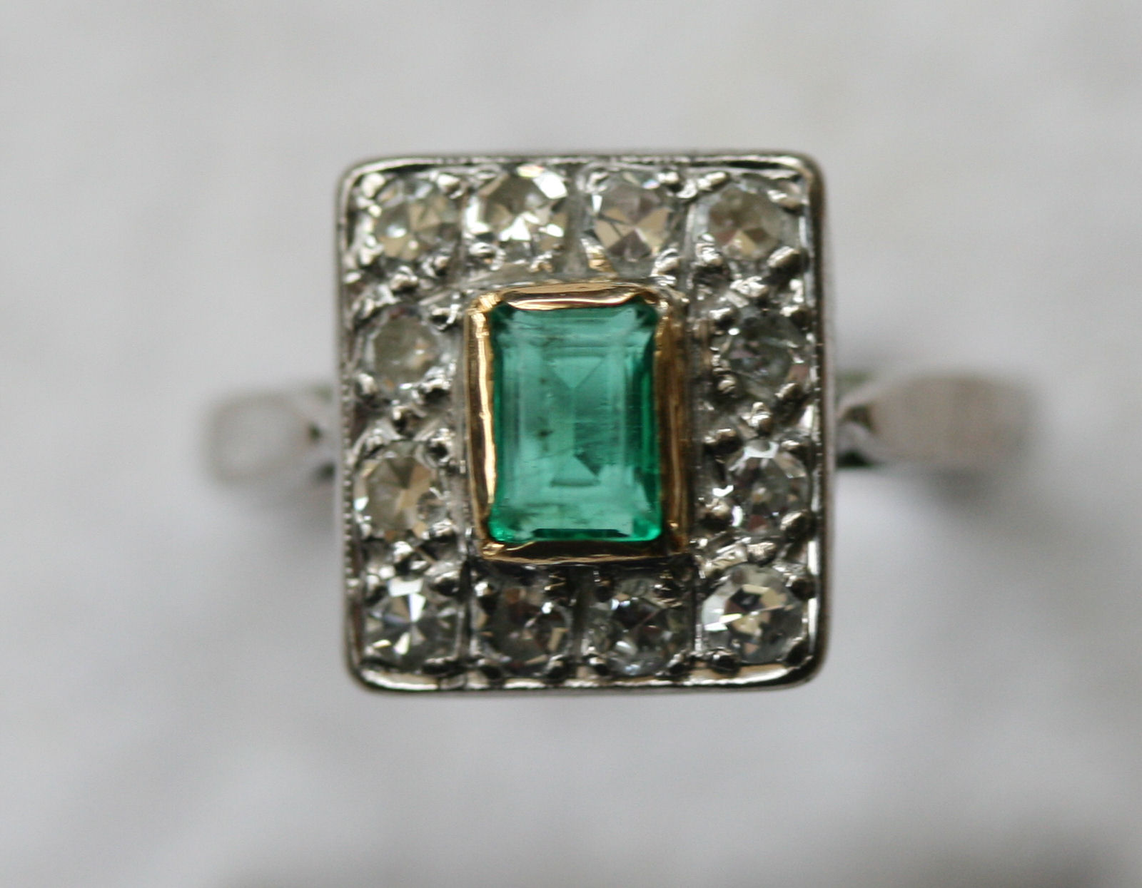 the rectangular cut emerald with a border of pave set circular cut diamonds