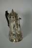 apparently unmarked, with flared slight baluster body with chased foliate scroll borders and simple scroll spout, with dome hinged cover and S scroll wooden handle
