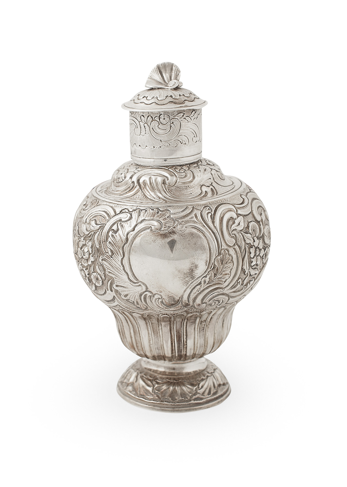 makers mark obscured ?V with star above, London 1744, of inverted pear shape with chased scroll borders and trailing foliage within, the twin vacant cartouches formed from C scrolls above the lower waisted section with concave fluting, raised on a domed base