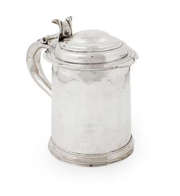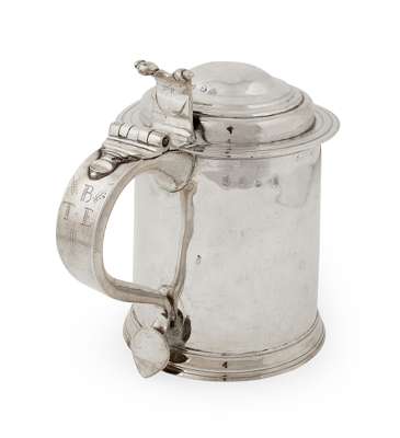 Robert Timbrell, London 1708, the plain cylindrical body with stepped foot, the hinged domed cover with large scrolling thumbpiece and cast detail to S scroll handle, the handle with engraved initials B/TE and with oval terminal