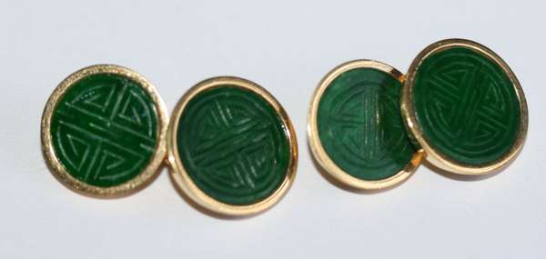 with graduated circular terminals inset with a circular jadeite panel incised with a Chinese four blessings/longevity symbol, conjoined by belcher form links, setting stamped 750