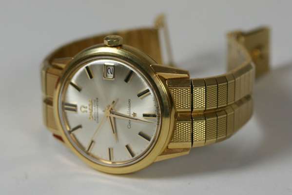 Constellation model, champagne dial, with sweep second hand and date aperture, baton numerals, flexible gold bracelet with clasp