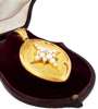 the pointed oval locket applied to the front with a slim six-pointed star claw set to the centre with an old mine cut diamond within a surround of half-pearls, all within a recessed quatrefoil motif, opening to reveal two glazed compartments, surmounted by a tapering bale, contained in a tooled maroon leather fitted case stamped HOWELL JAMES & CO...