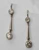 each composed of a millegrain collet set old European cut diamond, surmounting a tapering drop, suspending a larger similarly set diamond, with wire fittings