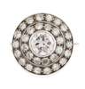 of circular target design, collet set to the centre with a round brilliant cut diamond, within two stepped borders of smaller similarly cut diamonds