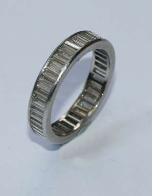 the all diamond ring, channel set with baguette diamonds and set in white metal, ring size O1/2