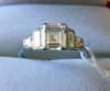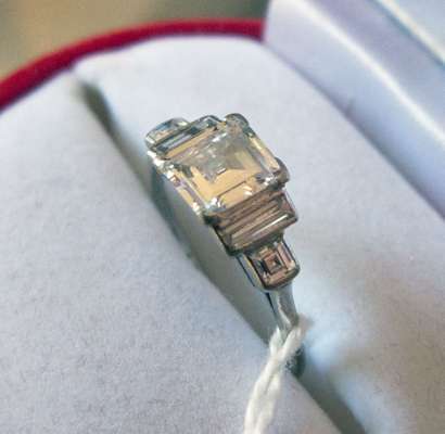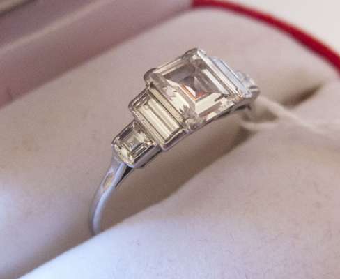 claw set with a square cut diamond, rubover set baguette cut diamond to each shoulder and a further rubover square cut diamond to the top of the shoulder, engraved inscription to the shank