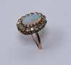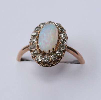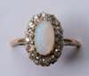 claw set to the centre with an oval cut opal within a slim oval border of similarly set old European cut diamonds, to a slim shank