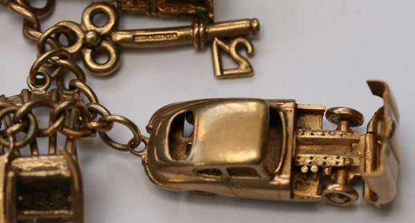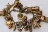 composed of curb form links with padlock form clasp and safety chain, suspending twenty-two assorted charms, including a miniature Scott monument and boxes containing £10 and £1 notes, model car etc