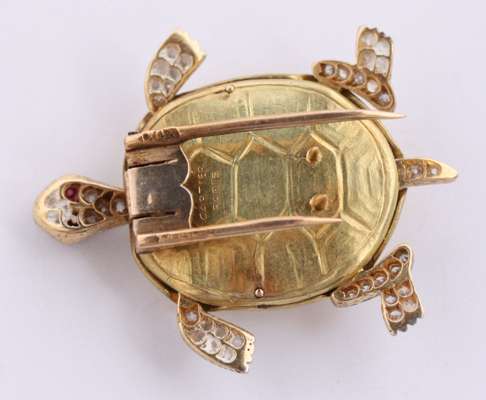 with naturalistically textured shell and articulated limbs, tail and head, pave set with old European and single cut diamonds, with circular cut ruby cabochon set eyes, signed, numbered indistinctly and stamped with French control marks