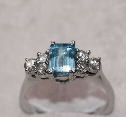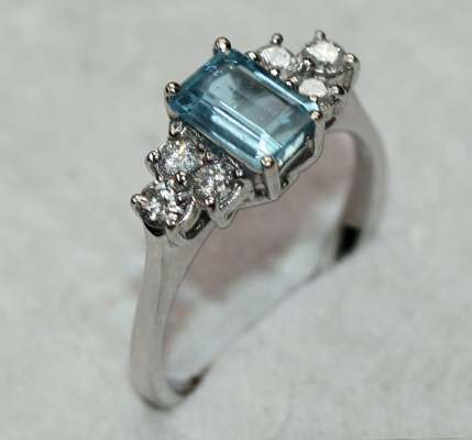 Height of ring to front 0.8cm, estimated weights: aquamarine 1.00cts, diamonds 0.30cts total