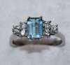 corner claw set to the centre with a step cut aquamarine, flanked to either side by three round brilliant cut diamonds, mount stamped 750
