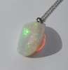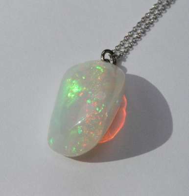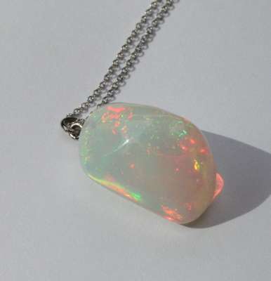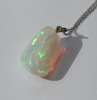 the pendant composed of a large polished opal pebble, showing good play of colour throughout, suspended from a fine trace link chain, clasp stamped 750 ITALY