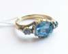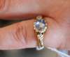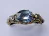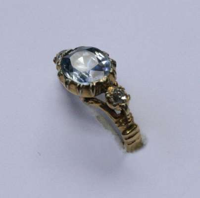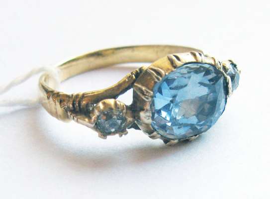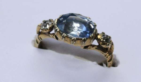 collet set to the centre with an oval cut cornflower blue sapphire, flanked to either side by an old mine cut diamond, each with closed back settings, with ribbed shoulders