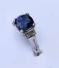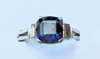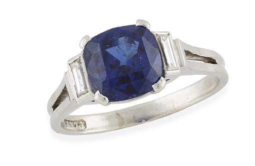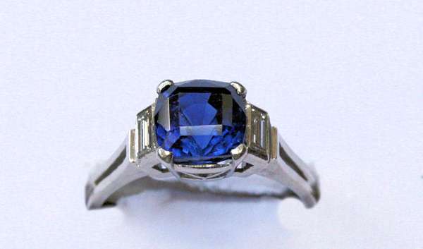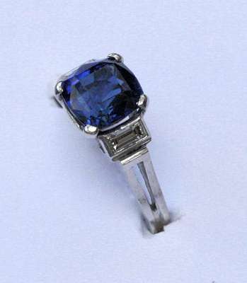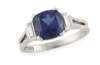 corner claw set to the centre with a square cushion cut sapphire, flanked by split shoulders each set with a baguette cut diamond