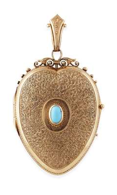 of slim design, collet set to the centre front with an oval cut turquoise cabochon within a textured surround and prick dot and beaded borders, with scroll surmount and tapering bale, engraved to reverse with heart shaped vacant cartouche