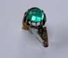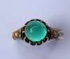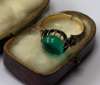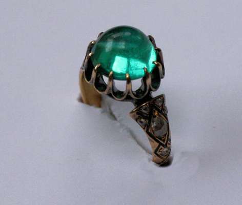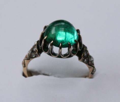 claw set with a circular cabochon cut emerald, with tapering shoulders set with rose cut diamonds to a lozenge textured ground, contained in a hinged shaped oval box