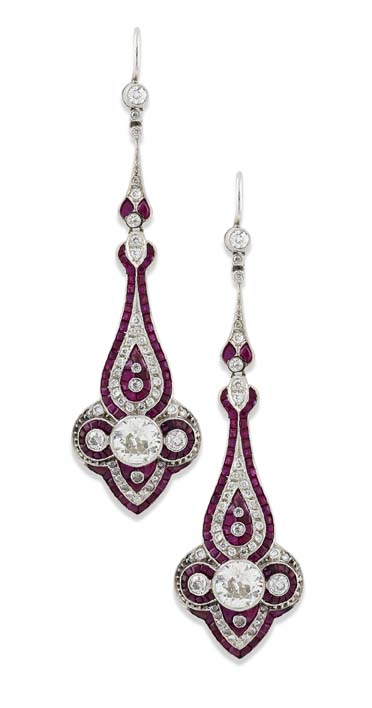 A pair of early 20th century STYLE ruby and diamond set pendant earrings