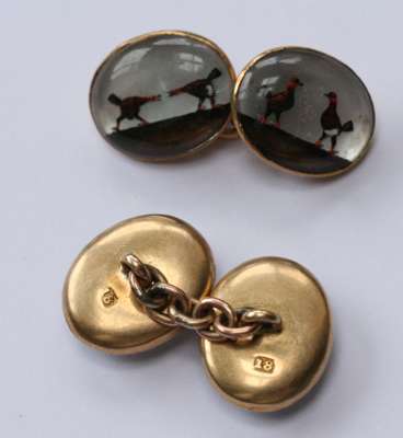 A pair of Edwardian 18ct gold mounted reverse crystal intaglio set cufflinks