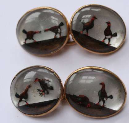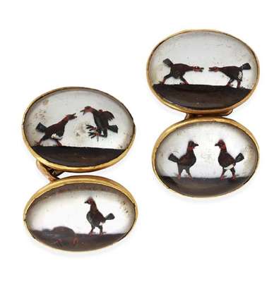 with oval terminals, each set with a reverse painted crystal intaglio depicting cock fighting, conjoined by belcher form links