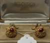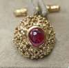each with domed shaped oval terminal, collet set to the centre with an oval cut ruby cabochon, within a beaded surround, conjoined by belcher form links to a bamboo form bar, set to each end with a circular rose cut ruby, contained in a cream suede covered case stamped BOUCHERON...