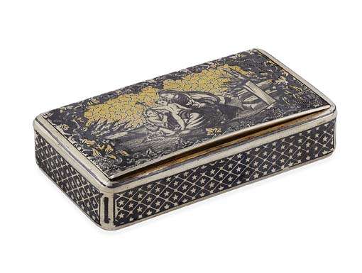 the body and base with all over diamond and star decoration, the hinged cover with raised thumbpiece and niello and gilt scene of Mary, Christ and John the Baptist