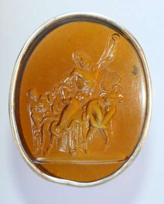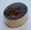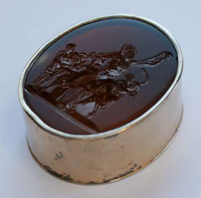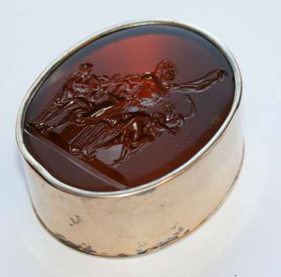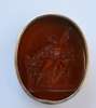 of oval form, unmarked, with carved intaglio cover decorated with two giant snakes attempting to kill Laokoon and his sons who were trying to warn Troy about the Trojan horse attack