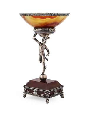 London import marks 1925, the shallow hardstone dish with corded and foliate border, raised on a figural stem of Mercury in classic pose resting on a shaped rectangle hardstone base with scrolling border and pineapple feet