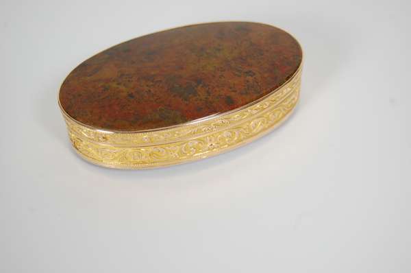 Paris circa 1789 - 1809, makers mark NH, the base and cover formed of oval panels of hardstone, the body of tooled gold with trailing foliate borders