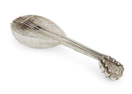 apparently unmarked, modelled as a lute, the case with well chased decoration of C scrolls and foliage, hinged cover with small stopper
