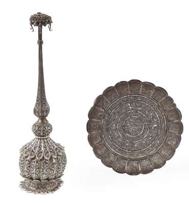 unmarked, the rose water sprinkler with slender neck with and multi head sprinklers with flower head motif, the lobed baluster body with flower head styled base and cover, over all with scrolling and foliate filigree wire formed panels; the stand of shaped circular outline with lobed border and rim around central panel of filigree borders and cartouches (2)