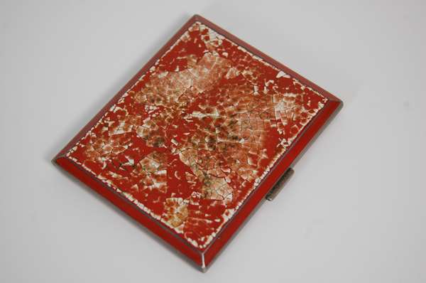 import marks London 1928, of canted square form with red enamel border enclosing a central red stained egg shell panel, with push button action
