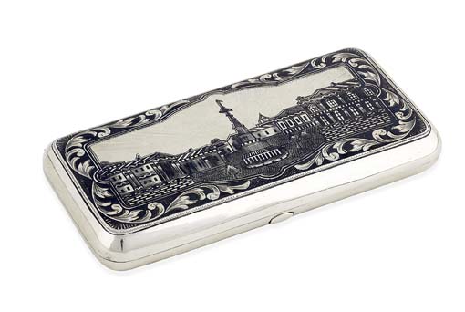 Moscow 1862, of rounded rectangular form, the hinged cover with niello panel of a city square, gilt interior and the base exterior with further niello decoration of a trllis ground with central monogram