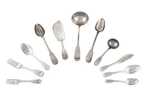 the majority W Ealey, W Fearn & W Chawner, London 1814, of single struck Fiddle and Thread with engraved crest to terminal, comprising; twenty four tablespoons eighteen tableforks (RB, London 1829) eighteen dessert spoons eighteen dessert forks (by McKay & Chisholm, Edinburgh 1849) eighteen teaspoons soup ladle serving spoon fish slice straining spoons two butter knives sugar tongs four sauce ladles