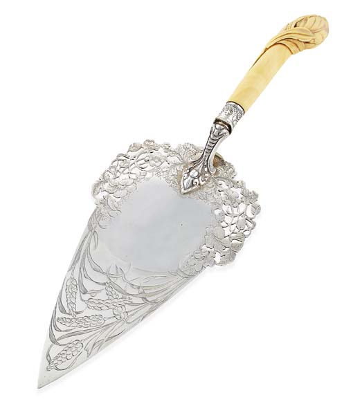 Mappin & Webb, Sheffield 1901, the large triangular blade with engraved and pierced floral borders, with cast short socket and carved ivory bud formed handle