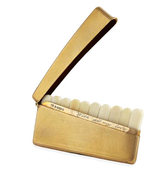 Chester 1926, of curved rectangular form with all over engine decoration, the hinged cover revealing ten ivory markers with stained Arabic numerals