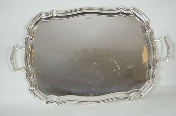 Sheffield 1918, of shaped rectangular form with scalloped edge and twin loop handles, inscribed 'Presented to The right Honble Lord Inverclyde of Castle Wemyss on the occasion of his marriage by the tenantry and outdoor employees at Castle Wemyss & Tradespeople'