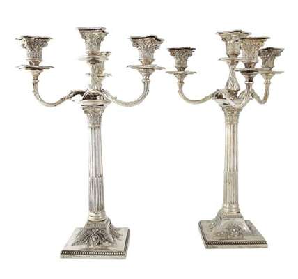 JKB, London 1891, the Corinthian columns with spreading square bases with floral swags around classical roundels, the three scrolling braches eminating from central sconce each with Corinthian terminal sconces (2)