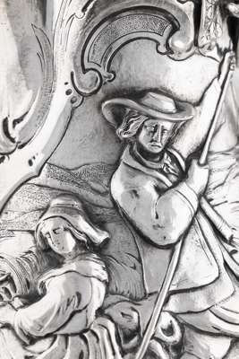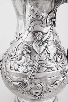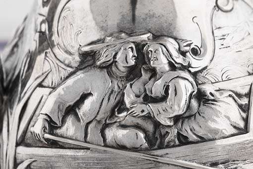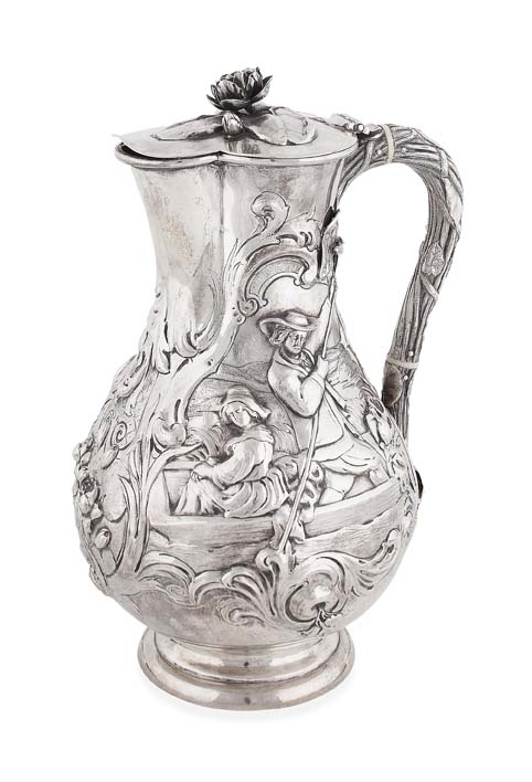 Robert Hennell, London 1854, retailed by CF Hancock 39 Brunton St London, the large baluster jug with profusely embossed foliate panels and rococo scroll cartouches enclosing pastoral scenes of a couple in a boat in embrace and to the opposing side with couple in discord, with naturalistic vine clasped handle and hinged cover with lily flower and pad finial