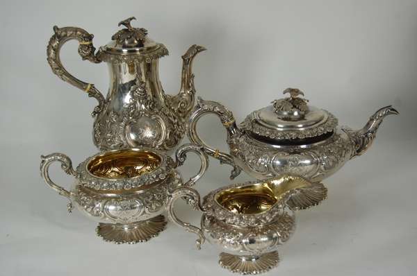 J Howden & Son, Edinburgh 1832, retailed by Elder & Co, comprising teapot, coffee pot, twin handled sugar bowl and milk jug, each of baluster form with embossed panels of flowerheads and foliage, the scroll formed cartouches with engraved armorial, with everted foliate rims and shell formed feet (4)