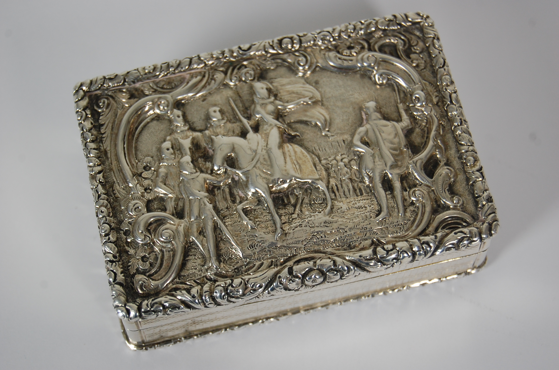 Joseph Wilmore, Birmingham 1828, the rectangular box with cast scene of a General addressing his troops, within foliate and scroll border, the body of the box with engine turned decoration and a presentation inscription to the base
