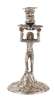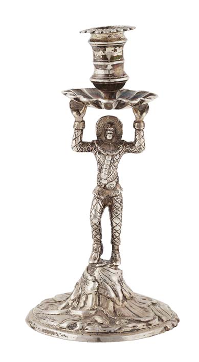 JC (possibly), London 1754, the stem formed from a cast figure of harlequin with arms raised holding a scalloped dish with sconce centrally set, the whole on a domed base with foliate and scroll decoration