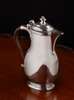 John Chartier, London 1715, the body of slightly flattened baluster form with V neck spout and leather covered S scroll handle, the domed hinged cover with moulded thumbpiece and urn finial with secondary hinged spout cover, raised on a stepped foot