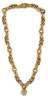 the necklace composed of fancy curb, scroll and plain circular links, the centre front scroll form links pave set with round brilliant cut diamonds, suspending an ovoid drop with similarly diamond set heart-shaped border, with concealed clasp and safety clip, with original leather fitted case