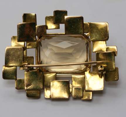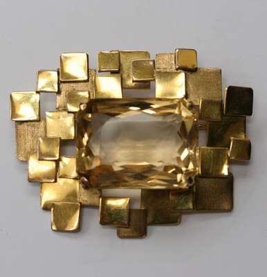 of modernist design, composed of graduated off-set square shaped links, with textured finish, fringed to the front by similar articulated links, with concealed clasp and safety clip, stamped with French control marks, also inscribed FRANCE 18KT GOLD, contained in a fitted case stamped HAMILTON & INCHES EDINBURGH... Together with HAMILTON & INCHES - a mid-20th century citrine set brooch of modernist design and shaped oval outline, corner claw set with a large fancy rectangular cut citrine, within an open border composed of overlapping graduated square panels with polished and textured finish, stamped H&I and 9ct