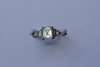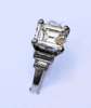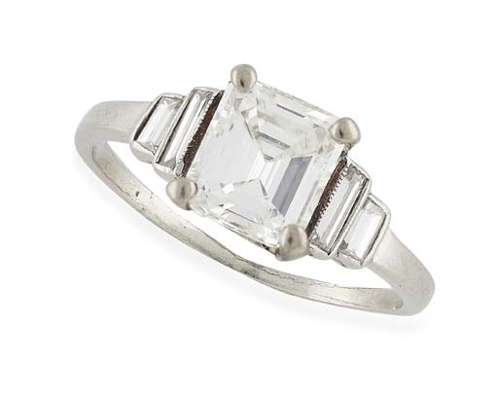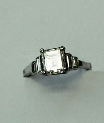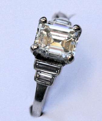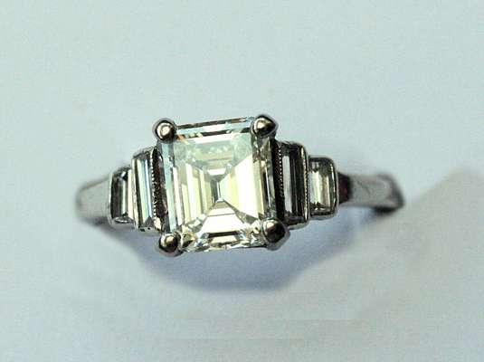 corner claw set with a trap cut diamond, flanked by stepped shoulders each set with two graduated baguette cut diamonds